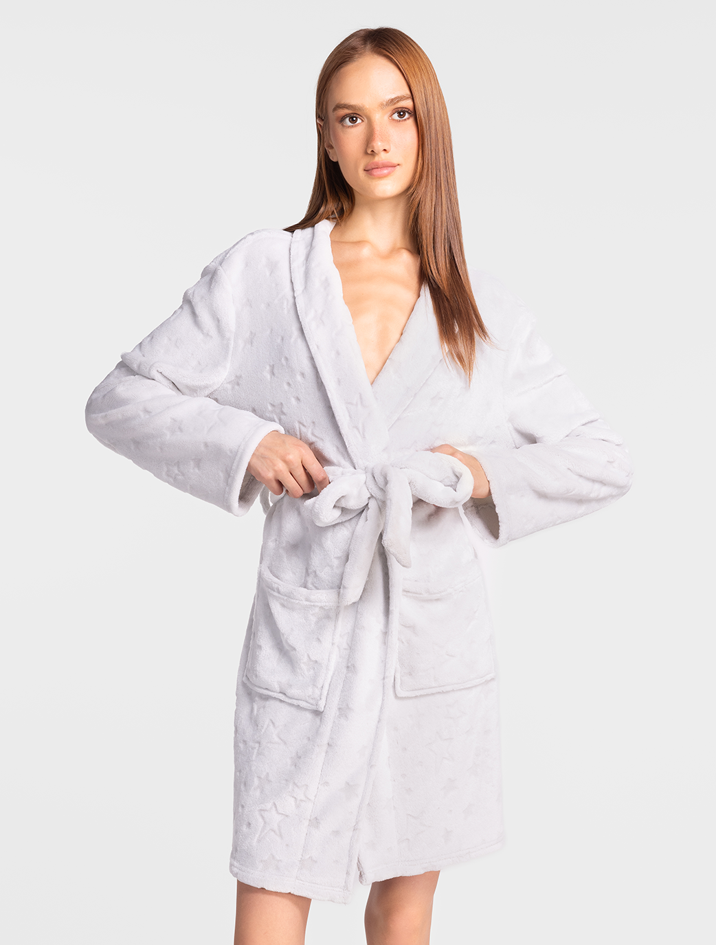 Wrap yourself in luxury with our Soft Plush Shawl Collar Robe, now featuring a playful star design. Made from ultra-soft plush fabric, it offers the perfect balance of comfort and warmth. With long sleeves, a removable belt, a cozy shawl collar, and handy side pockets, this mid-thigh length robe is as practical as it is chic finished with stars that add a dreamy touch.
