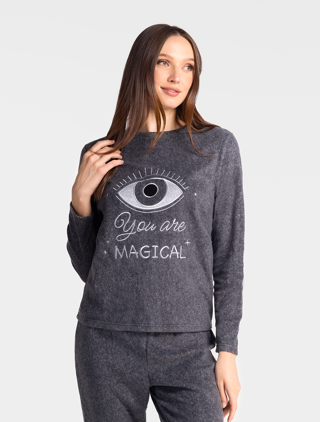 Wrap yourself in comfort and a little magic with this dark grey polar fleece pajama top. Featuring a sparkling eye graphic and the uplifting message “You are magical,” it’s the perfect blend of warmth, softness, and positive vibes for your nighttime routine.