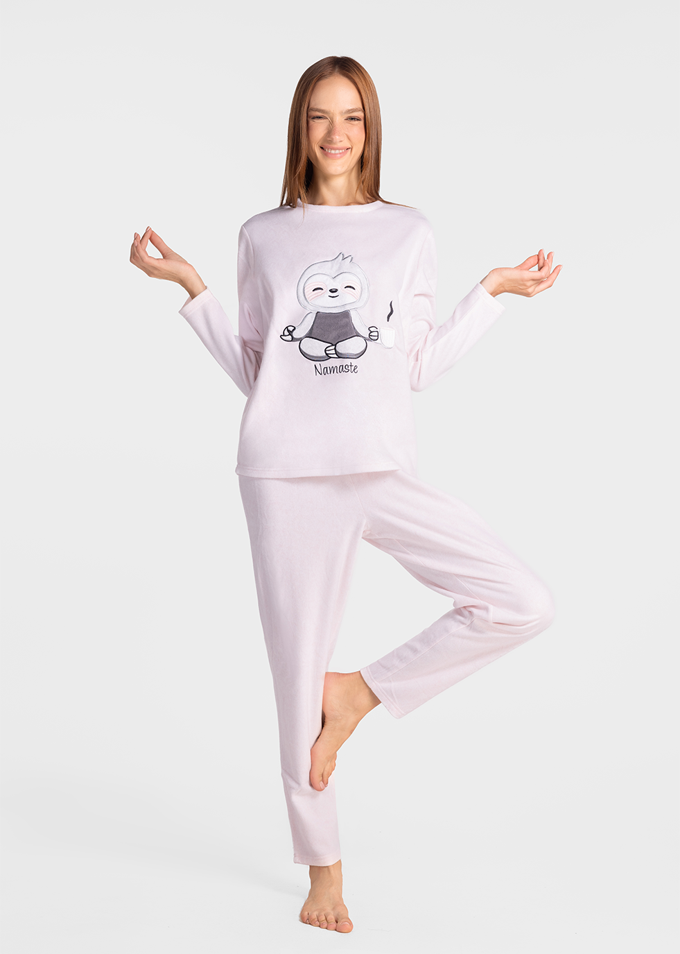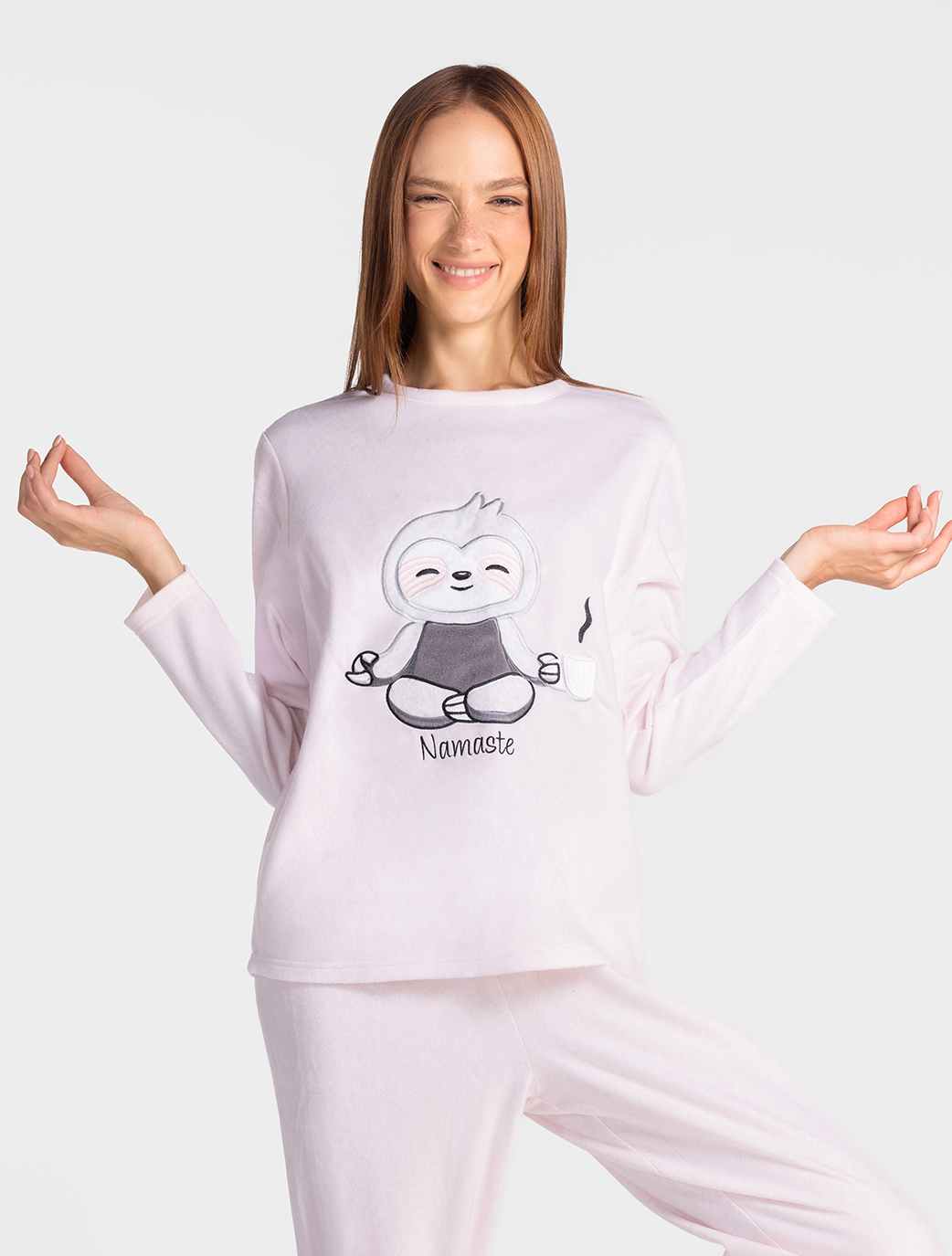 Cozy up in this adorable Namaste polar fleece pajama top featuring a smiling sloth in a peaceful yoga pose. Soft in texture and pink in color, it adds warmth and charm to your loungewear. Perfect for relaxed mornings with a hot drink and a calm mind.