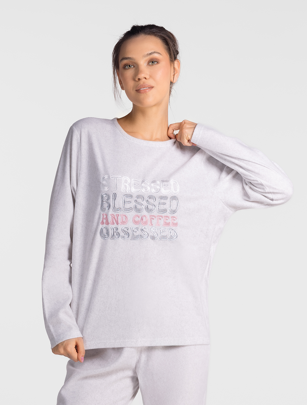 Get comfy in this soft polar fleece pajama top featuring the playful slogan: "Stressed, Blessed, and Coffee Obsessed." In a soothing light grey, this top is perfect for cozy mornings or caffeine-fueled evenings. A must-have for coffee lovers and chill seekers alike!