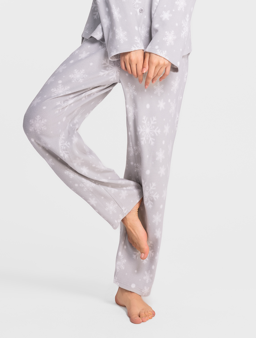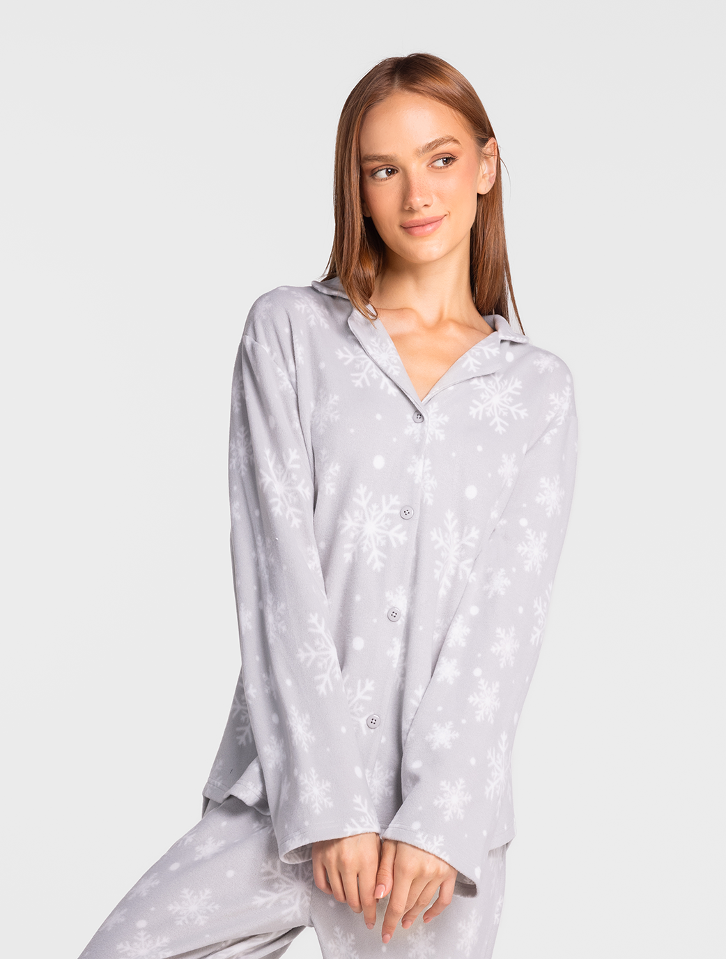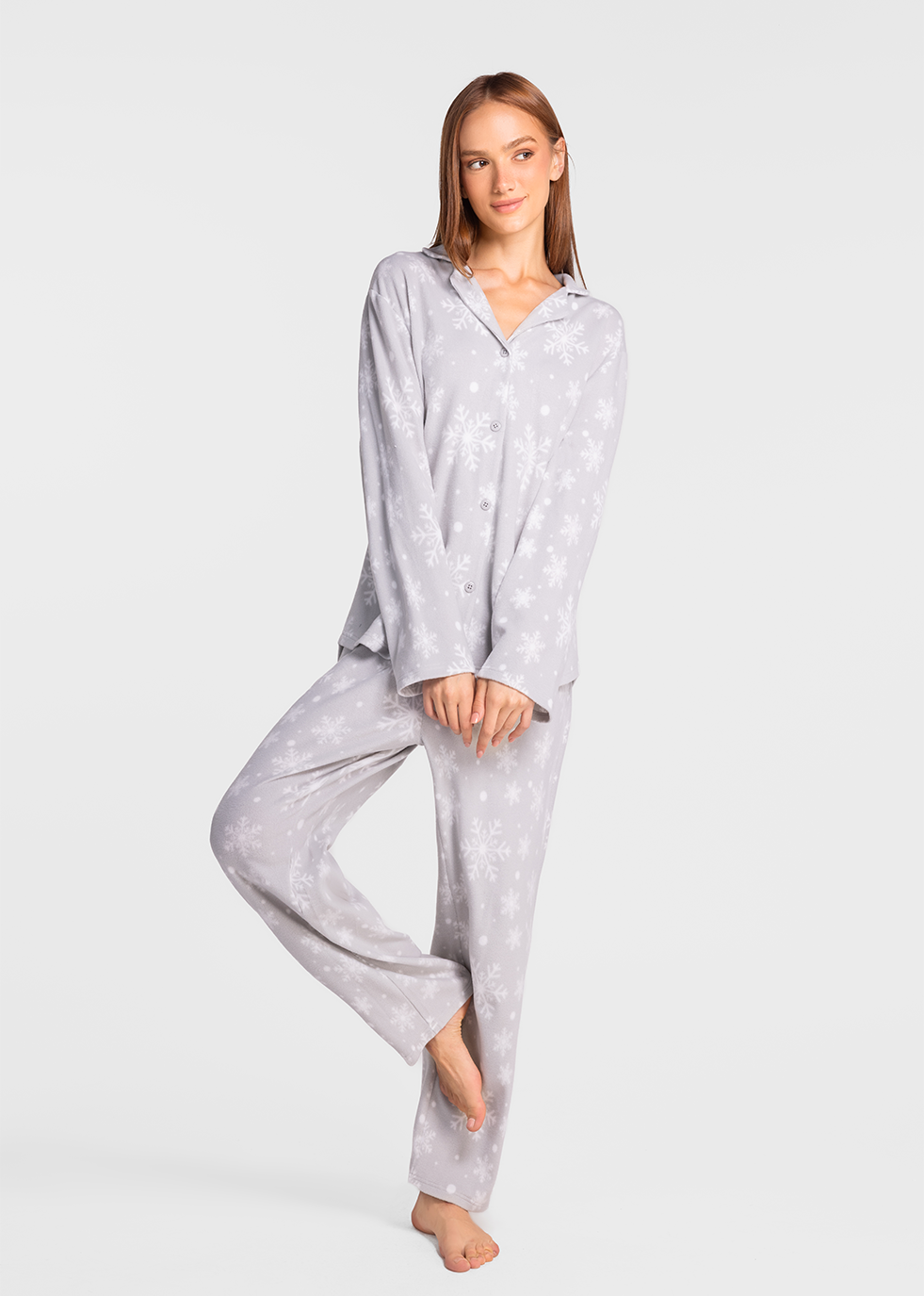 Sinowa Set captures the magic of winter with delicate snowflake prints on a soft light grey base. Featuring a classic pajama cut with a button-up top and relaxed drawstring pants, it’s the perfect blend of cozy comfort and seasonal charm.
