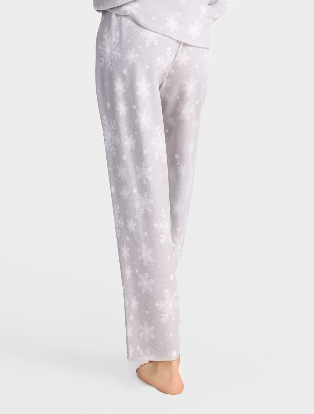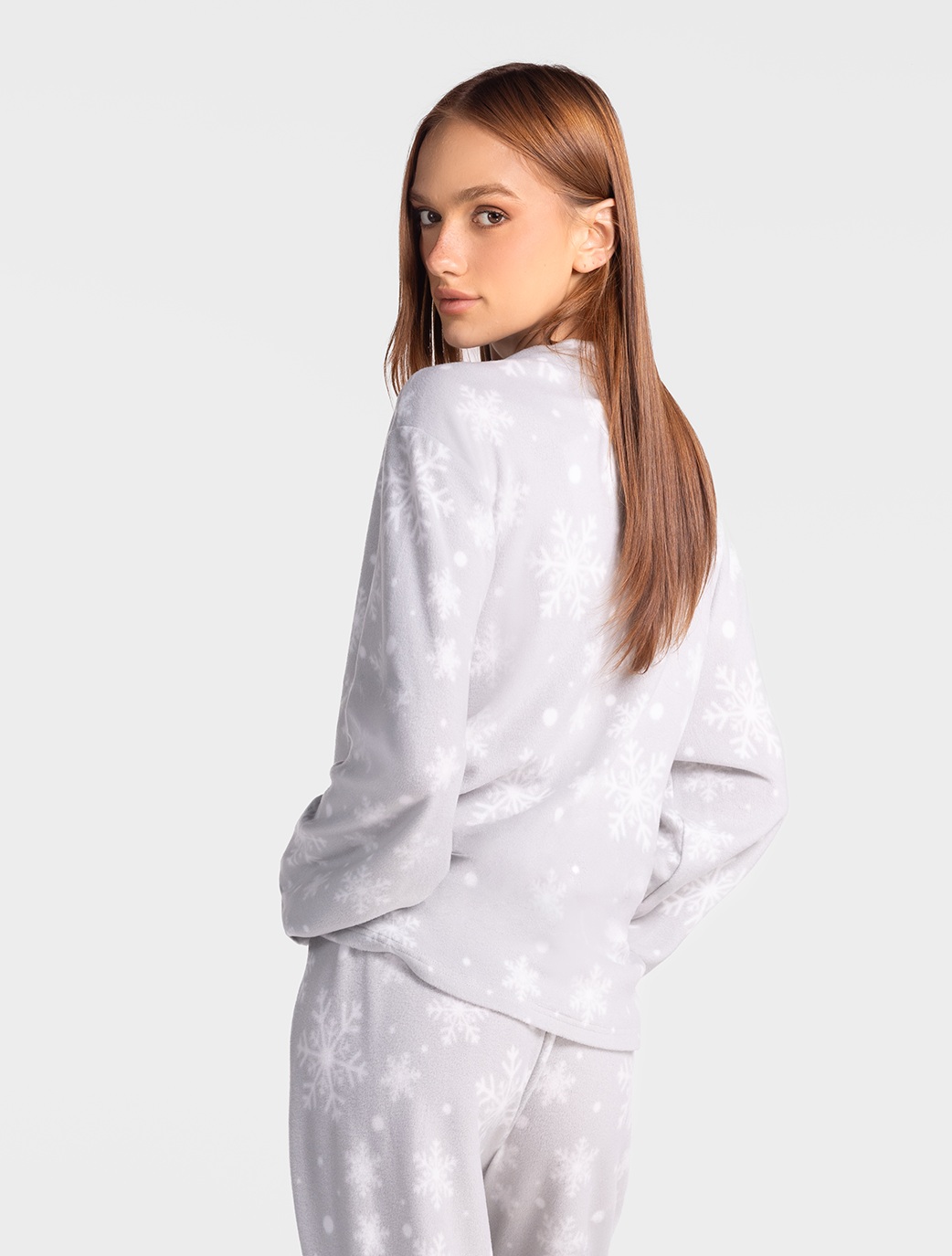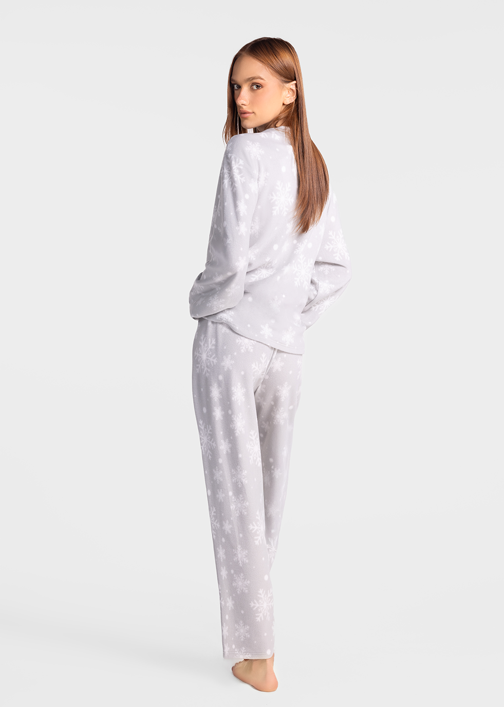 Sinowa Set captures the magic of winter with delicate snowflake prints on a soft light grey base. Featuring a classic pajama cut with a button-up top and relaxed drawstring pants, it’s the perfect blend of cozy comfort and seasonal charm.