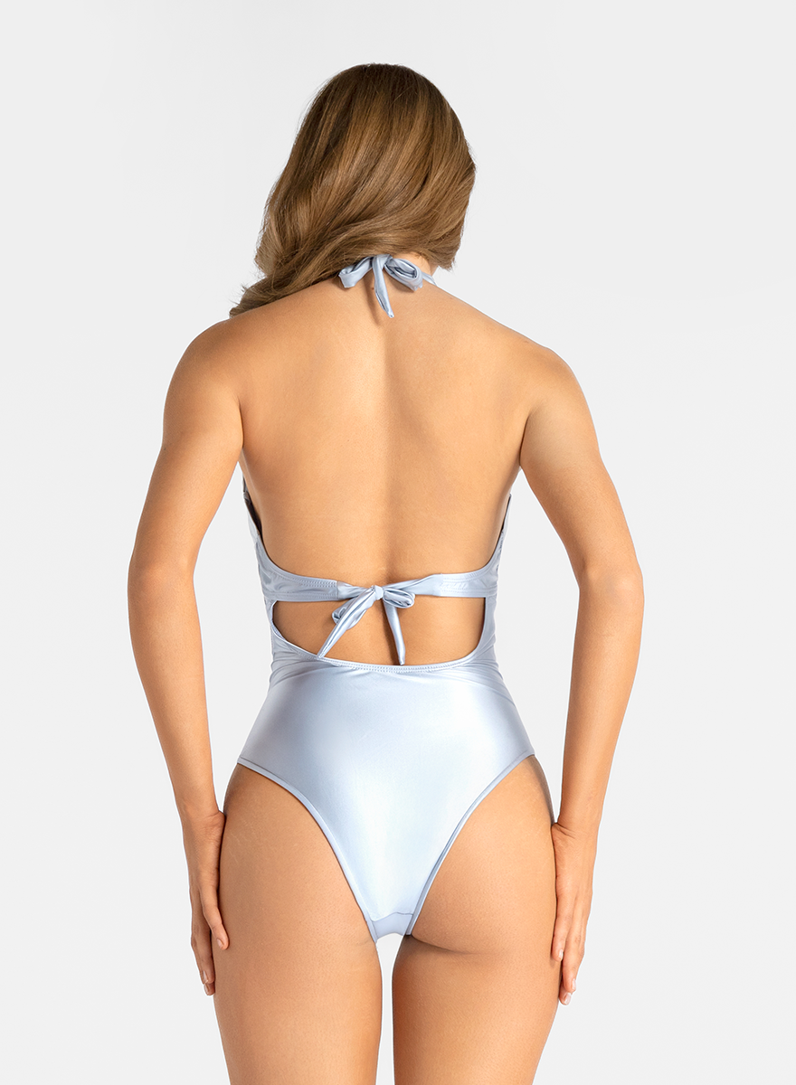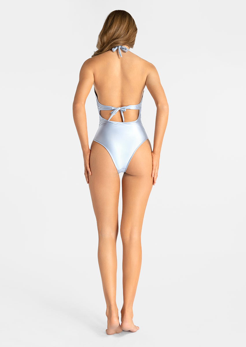 This elegant one-piece swimsuit is designed with a striking plunge neckline and a high-sheen, light blue iridescent finish. The bodice features a structured underbust seam for support, flowing into a deep V-cut that is mirrored by an open-back design. To ensure a secure and personalized fit, the suit is finished with adjustable ties at both the neck and the center of the back.